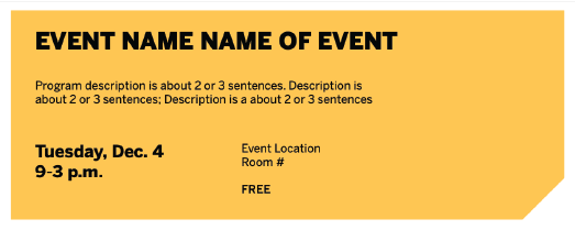 Be sure key information is most prominent. Abstracts and event summaries should be limited to one sentence and should be the most compelling selling point for the event. Use no more than two images per ad and leave space around the edge of the ad to avoid crowding.